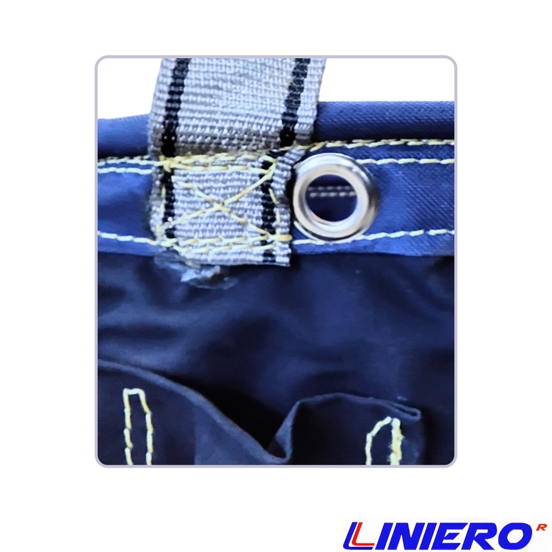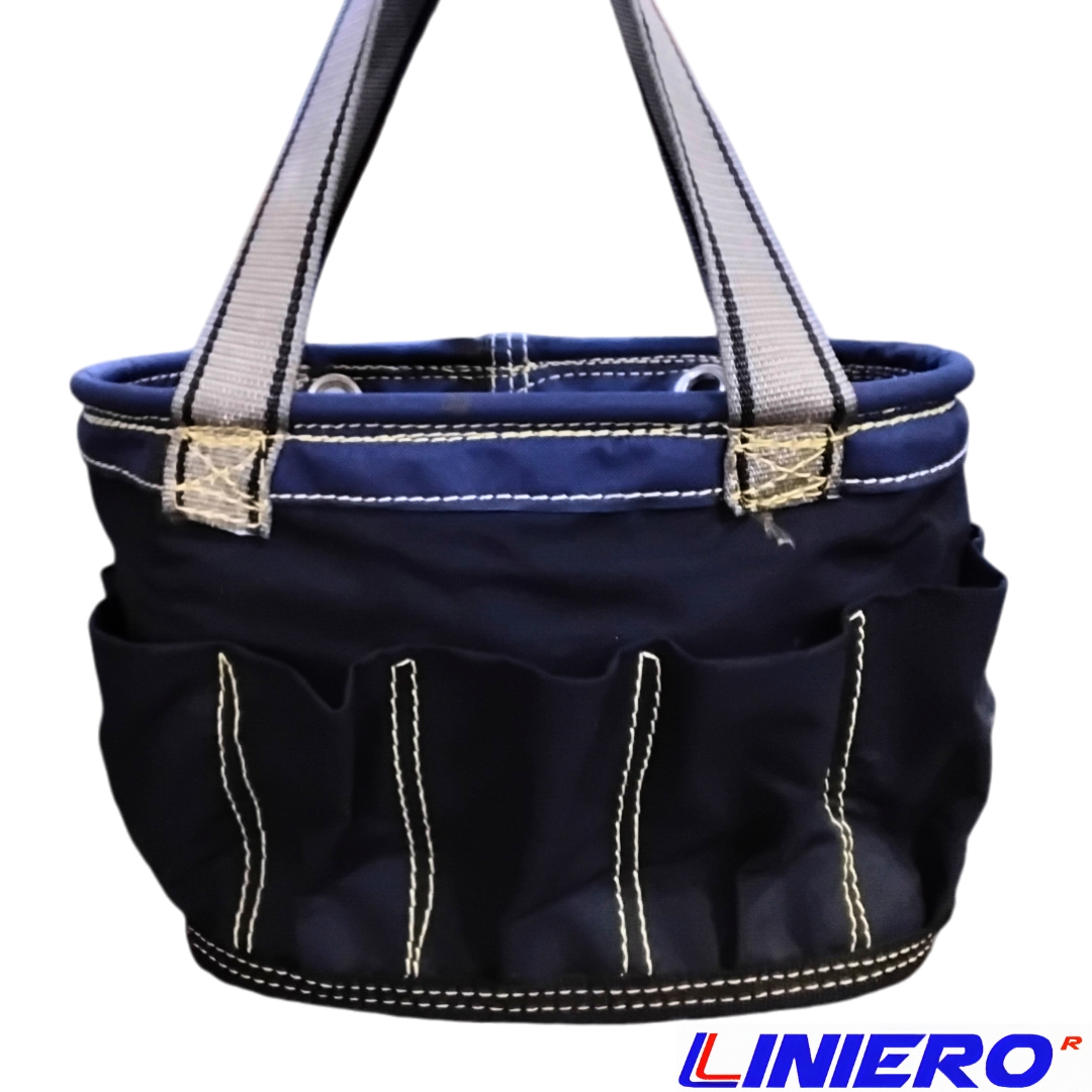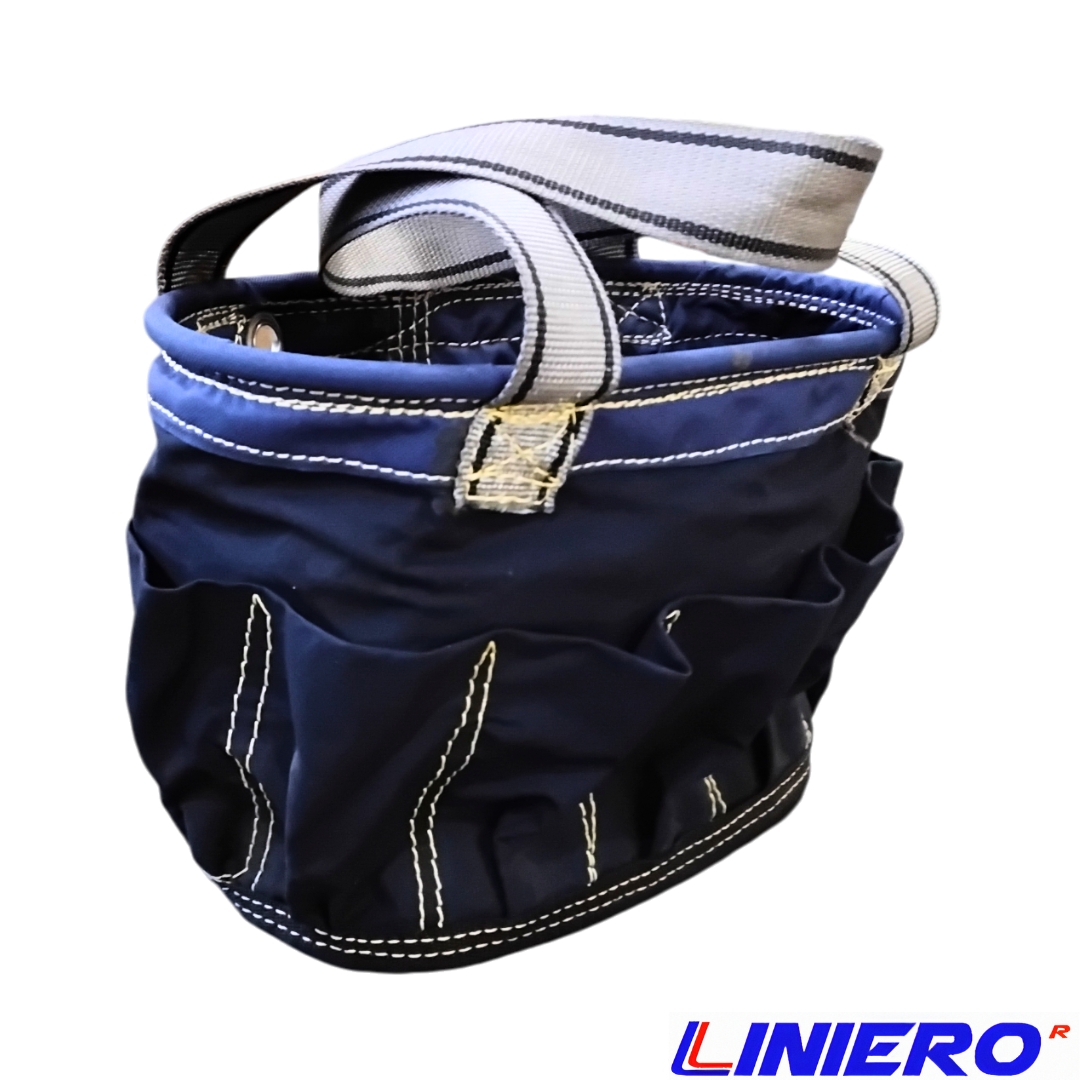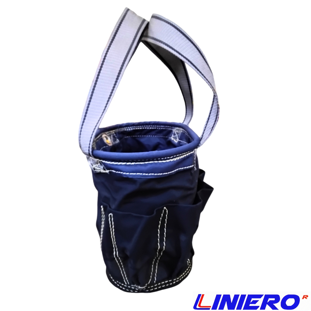 Confeccionado en doble capa de lona cruda de 8 onzas de alta tenacidad, este balde presenta una estructura reforzada con cuero descarne. Equipado con boca y aro de acero, doble fondo de cuero , sueleta y dos asas de cinta garantiza una manipulación segura y eficiente para la colocación de herramientas y otros utensilios.