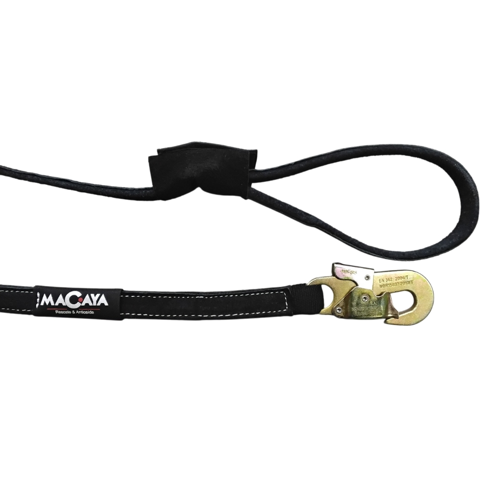 Cinta de anclaje en poliéster de 25 mm, forrada en cuero, con mosquetón 107 y ojo. Ideal para generar puntos de anclaje en trabajos en altura.