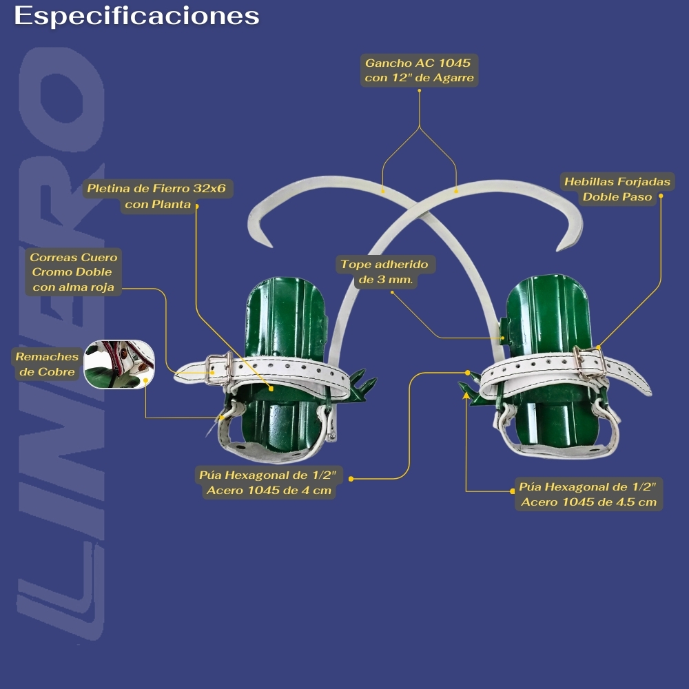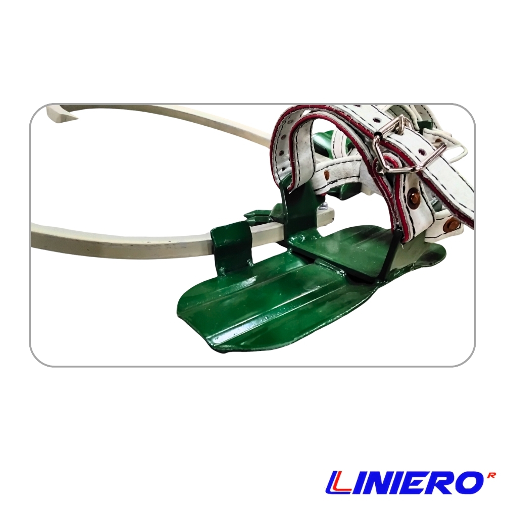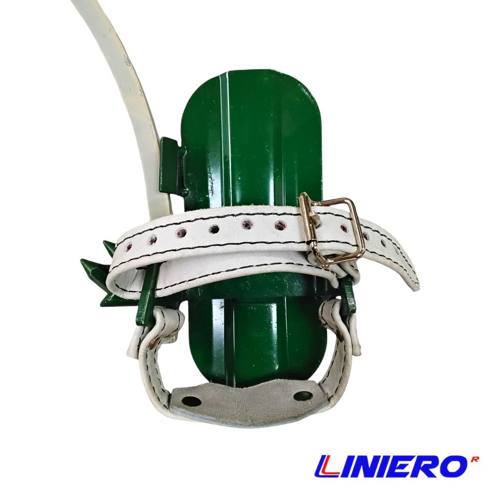 - Correas Cuero Cromo Doble con alma roja: Las correas de cuero cromo no solo proporcionan mayor resistencia, sino que también son ajustables para adaptarse a diferentes tamaños del pie. Todas las correas de la trepadera son confeccionadas con doble capa teniendo un alma de cinta roja en el centro como alerta de desgaste, adicionalmente la cinta roja tiene 3 dobleces para una alta resistencia y tenacidad, esto permite que la correa no se desgarre con el uso constante ni con el espigón de la hebilla.